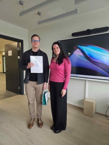 3.vieta – Renāts Vasiļjevs, 1. kursa maģistrants (studiju programma: Materiālzinātne un nanotehnoloģijas) ar referātu “Galliju saturoša amorfā kalcija fosfāta sintēze, raksturošana un saķepināšana“, zinātniskās vadītājas: Doc., Dr.sc.ing. L.Stīpniece, pētn., Mg.sc.ing. M.Ščeglova.
