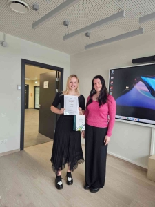 3.vieta – Elīna Ķelle, 4. kursa bakalaurante (studiju programma: Ķīmija un ķīmijas tehnoloģija) ar referātu “Jūras polisaharīdu un zīda fibroīna hidrogēlu izstrāde”, zinātniskā vadītāja: Pētn., Mg.sc.ing. K.Egle.